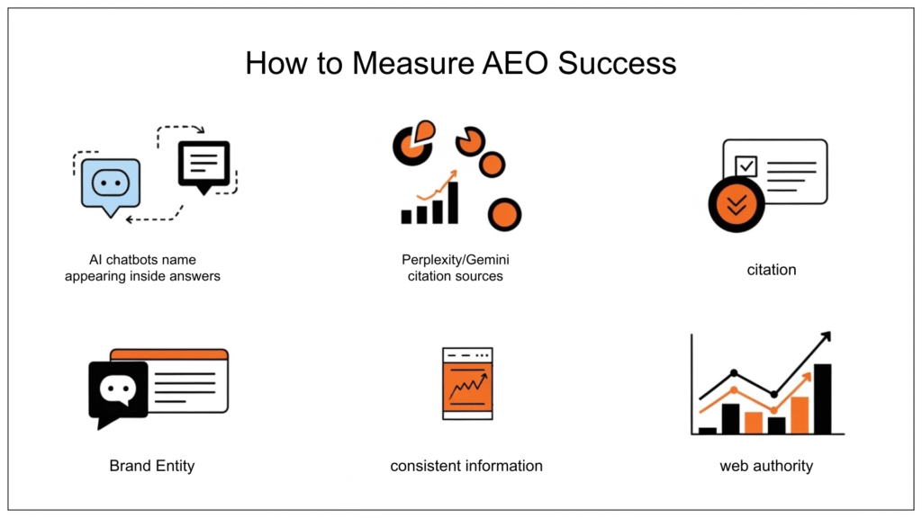 Measuring AEO success is completely different from traditional SEO because you’re not tracking rankings or clicks; you’re tracking how often AI systems actually use your content. The strongest signal of AEO performance is seeing your brand, facts, definitions, or frameworks appear inside answers generated by ChatGPT, Gemini, Claude, and Perplexity. You should regularly test relevant questions inside these AI tools and look for any mention of your business, even if it’s indirect or paraphrased. These appearances are the new version of “position #1.”